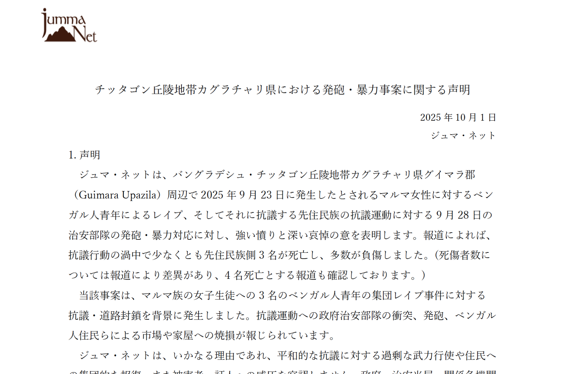 ジュマ・ネットは、バングラデシュ・チッタゴン丘陵地帯カグラチャリ県グイマラ郡周辺で2025年9月23日に発生したとされるマルマ女性に対するベンガル人青年によるレイプ、そしてそれに抗議する先住民族の抗議運動に対する9月28日の治安部隊の発砲・暴力対応に対し、強い憤りと深い哀悼の意を表明します。